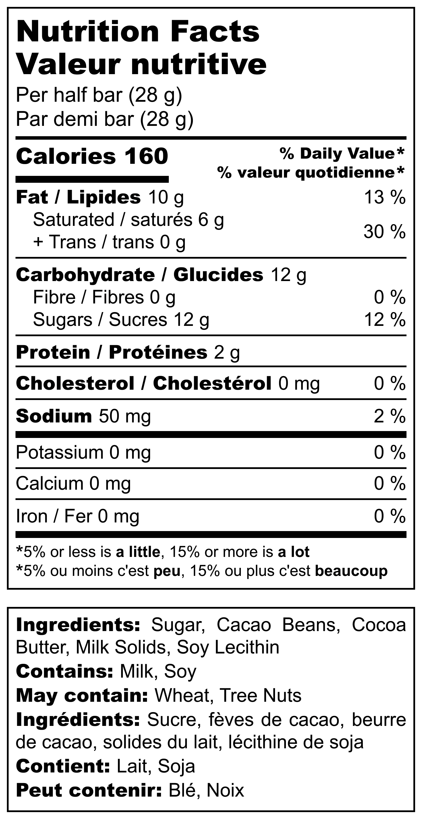 Ingredients: Milk chocolate (cocoa beans, cocoa butter, sugar, milk solids, soy lecithin)